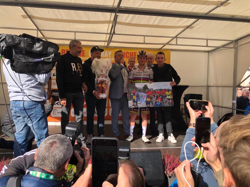 A Binche, la ville de départ de la course, c’est l’effervescence. Et pour cause, deux stars du cyclisme belge sont au départ : Remco Evenepoel, récent champion du monde et Philippe Gilbert, qui dispute sa dernière course en Belgique avant sa retraite (et champion du Monde il y a 10 ans).