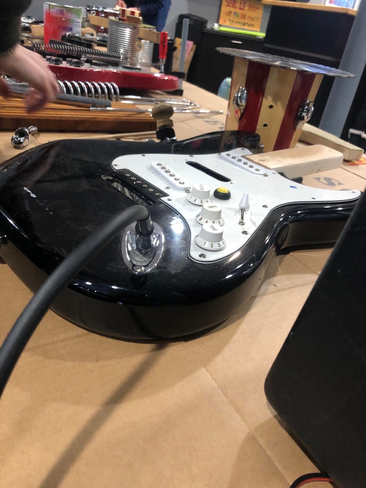 Dans ce laboratoire, ces participants testent bien des choses. Tout part de dons comme cette guitare qui elle aussi aura droit à une seconde vie.