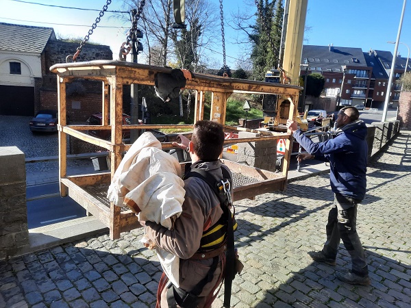 Profitant de la présence de cet engin, la Fabrique d'église a fait procéder à des travaux d'entretien : démoussage et arrachage des arbres qui avaient pris racine dans la tour du bâtiment de style gothique hainuyer basé sur une construction du XIIIème siècle.