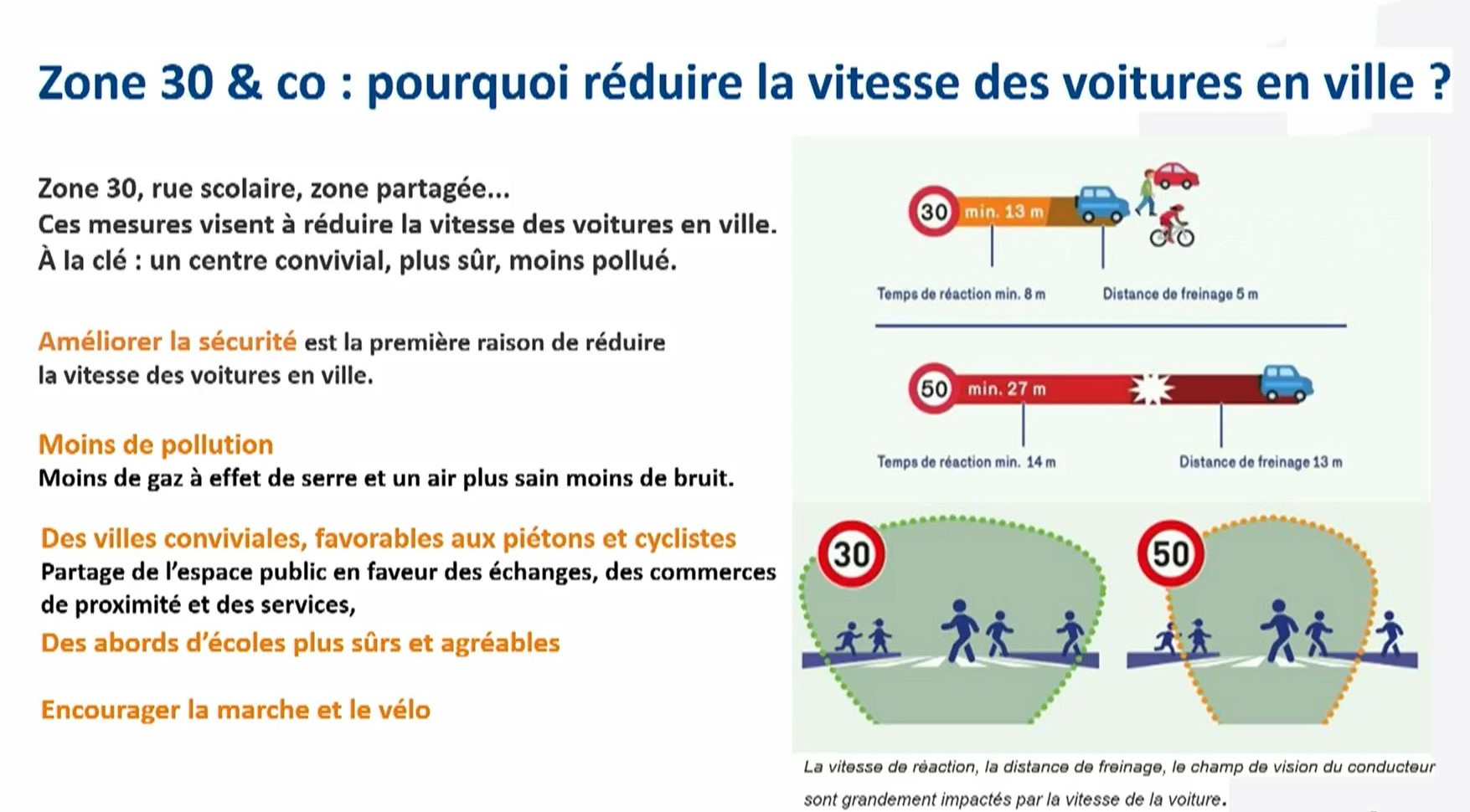 Une voiture roulant à du 30 à l’heure pollue moins, freine plus rapidement, fait moins de bruit qu’à du 50. Une évidence qui n’est plus à démontrer. La création de la zone 30 devrait créer un centre-ville « apaisé » favorisant la mobilité douce.
