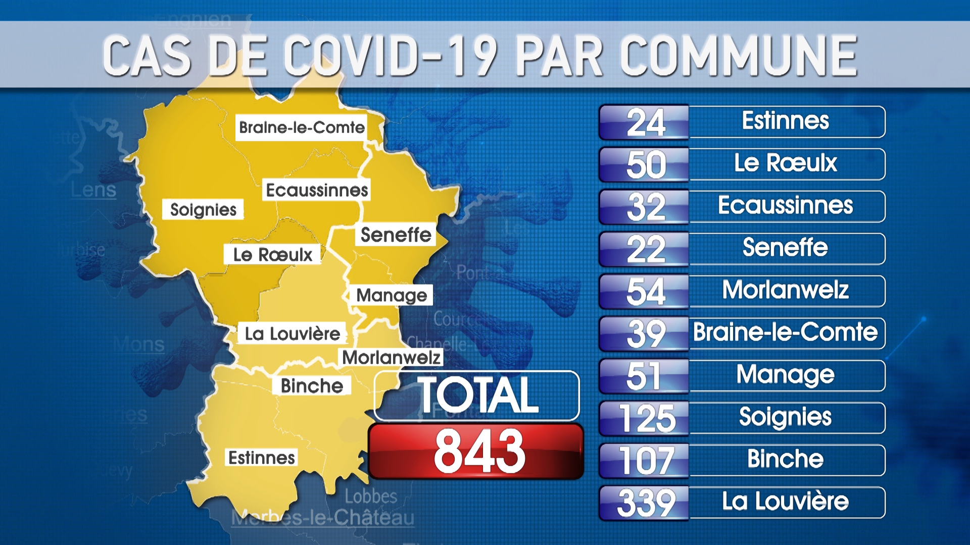 NDLR : Attention ces chiffres sont ceux communiqués par le SPF Santé et sont basés sur les tests effectués notamment en milieux hospitaliers. Ils ne sont donc pas le reflet exact de l'état de la pandémie dans notre région. Mais étant les seuls chiffres officiels disponibles, nous estimons important de les diffuser.