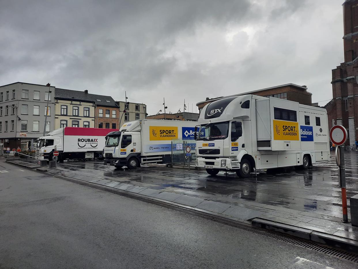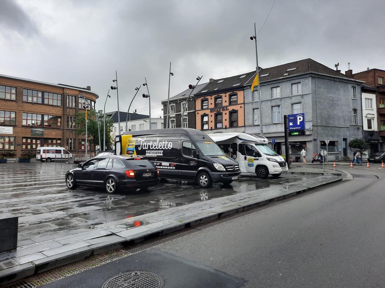 Les cars des équipes prennent déjà possession de la Place Maugrétout.