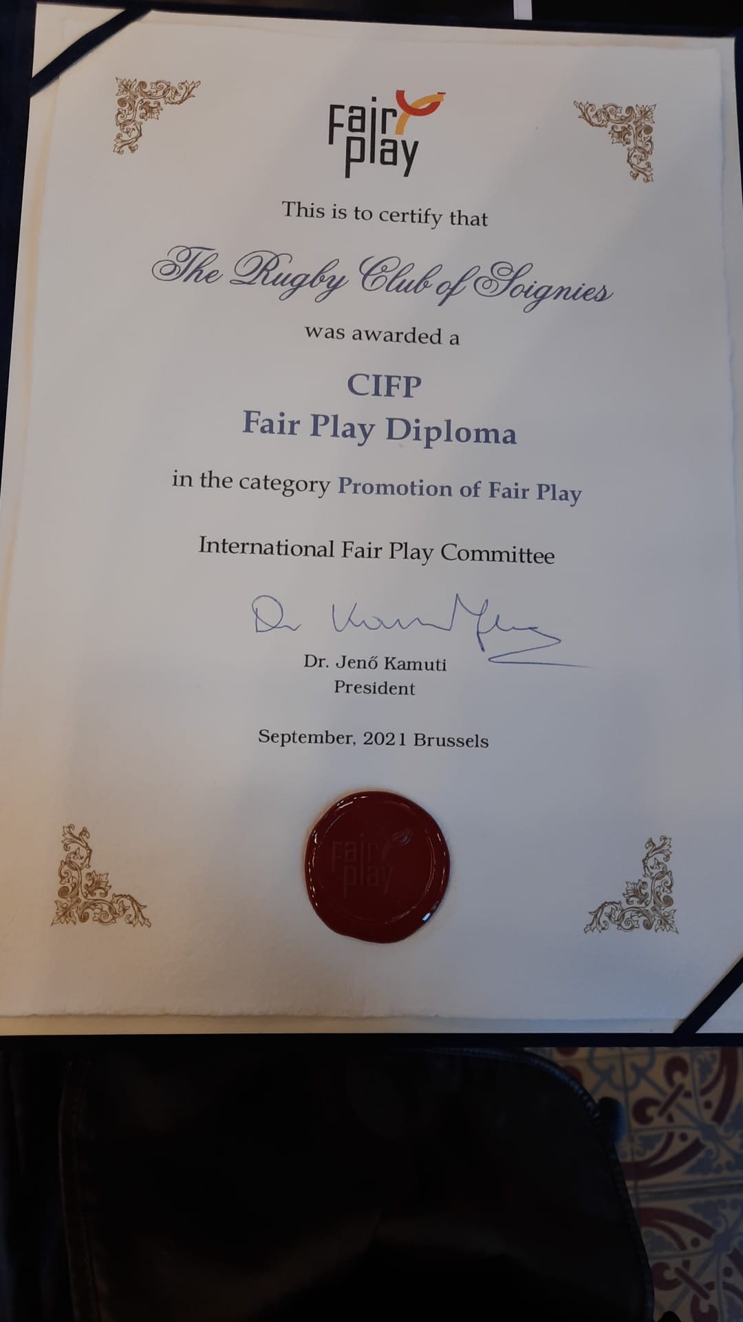 Dans le cadre de la deuxième édition de la Journée mondiale du Fair-Play, le Rugby Club Soignies a reçu un prix distinguant ses efforts dans la promotion du fair-play.