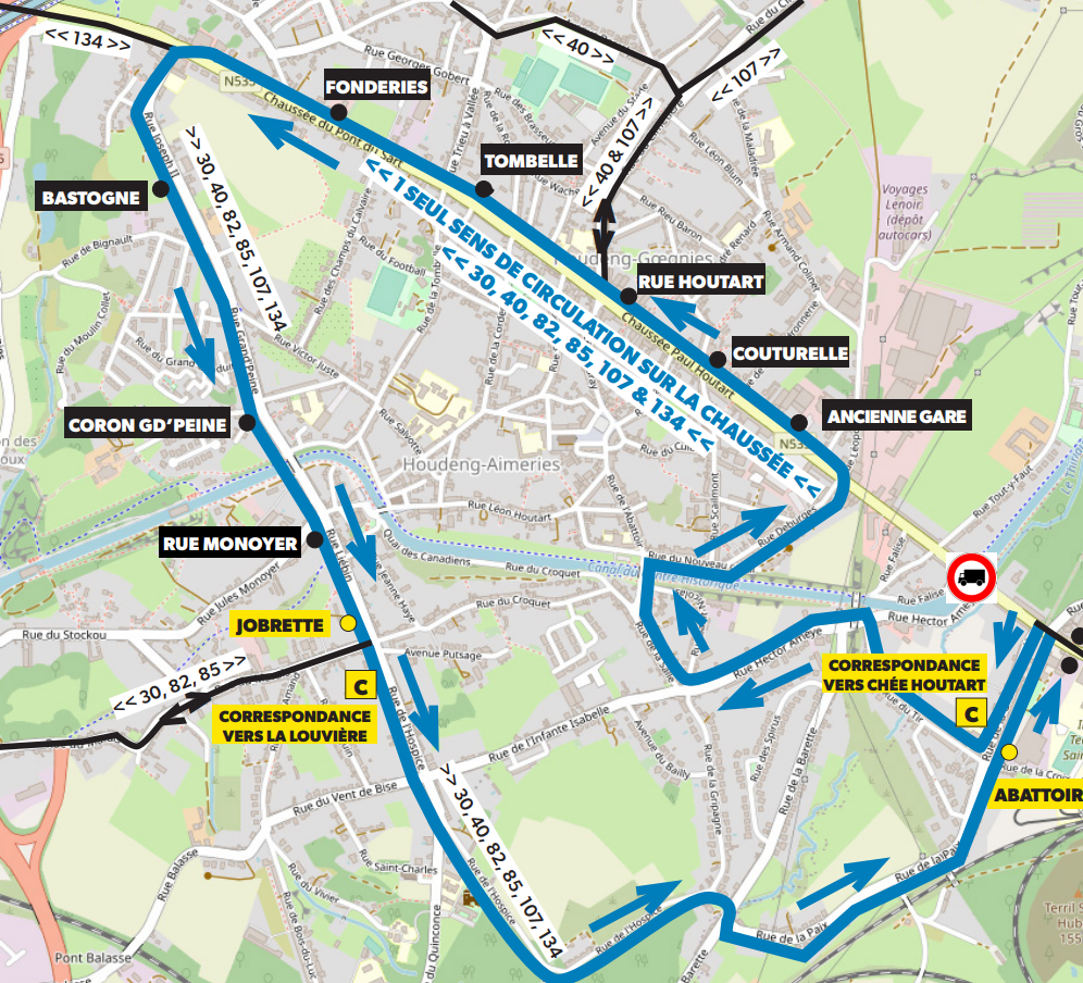En direction de Mons ou Soignies, les bus emprunteront cette même rue mais rejoindront la chaussée Houtart au niveau de l’ancienne gare d’Houdeng avant de reprendre leur itinéraire normal.