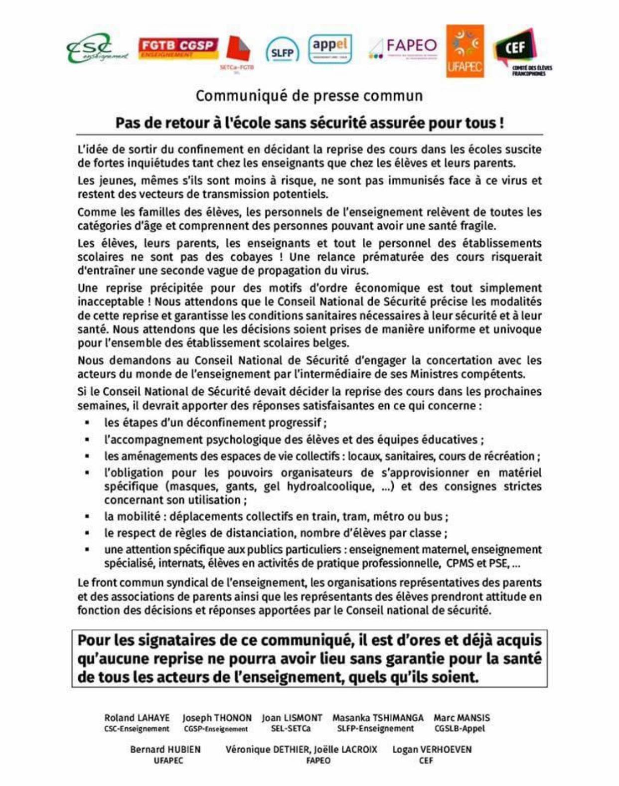 L'idée de sortir du confinement en décidant la reprise des cours dans les écoles suscite de fortes inquiétudes tant chez les enseignants que chez les élèves et leurs parents. Pour les signataires de ce communiqué, il est déjà acquis qu'aucune reprise ne pourra avoir lieu sans garantie pour la santé de tous les acteurs de l'enseignement, quels qu'ils soient.