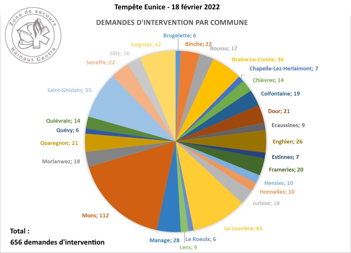 La Tempête Eunice qui était de passage dans notre pays ce vendredi 18 février a causé bien des dégâts. Sans gravité mais ce ne sont pas moins de 656 demandes d’interventions, en moins de 12 heures qui ont été enregistrées par la Zone de Secours Hainaut Centre et ce, pour l’ensemble de son territoire qui compte 28 communes.