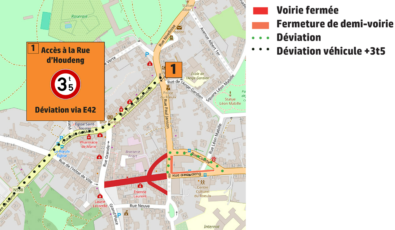 - La circulation est également interdite aux véhicules de plus de 3,5 tonnes dans le sens Soignies - La Louvière. Ces véhicules seront redirigés vers la Chaussée de Mons afin de rejoindre l'E42.