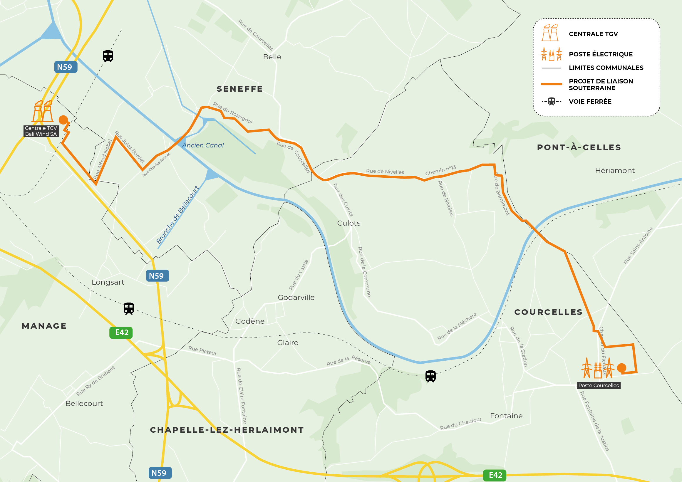 Quatre communes sont concernées : Manage, Seneffe, Courcelles et Pont-à-Celles. Elia ne s'occupe que du transport de l'électricité qui sera produite par Bali Wind, une filiale d'Eneco et c'est le chantier de câblage qui est à l'ordre du jour.