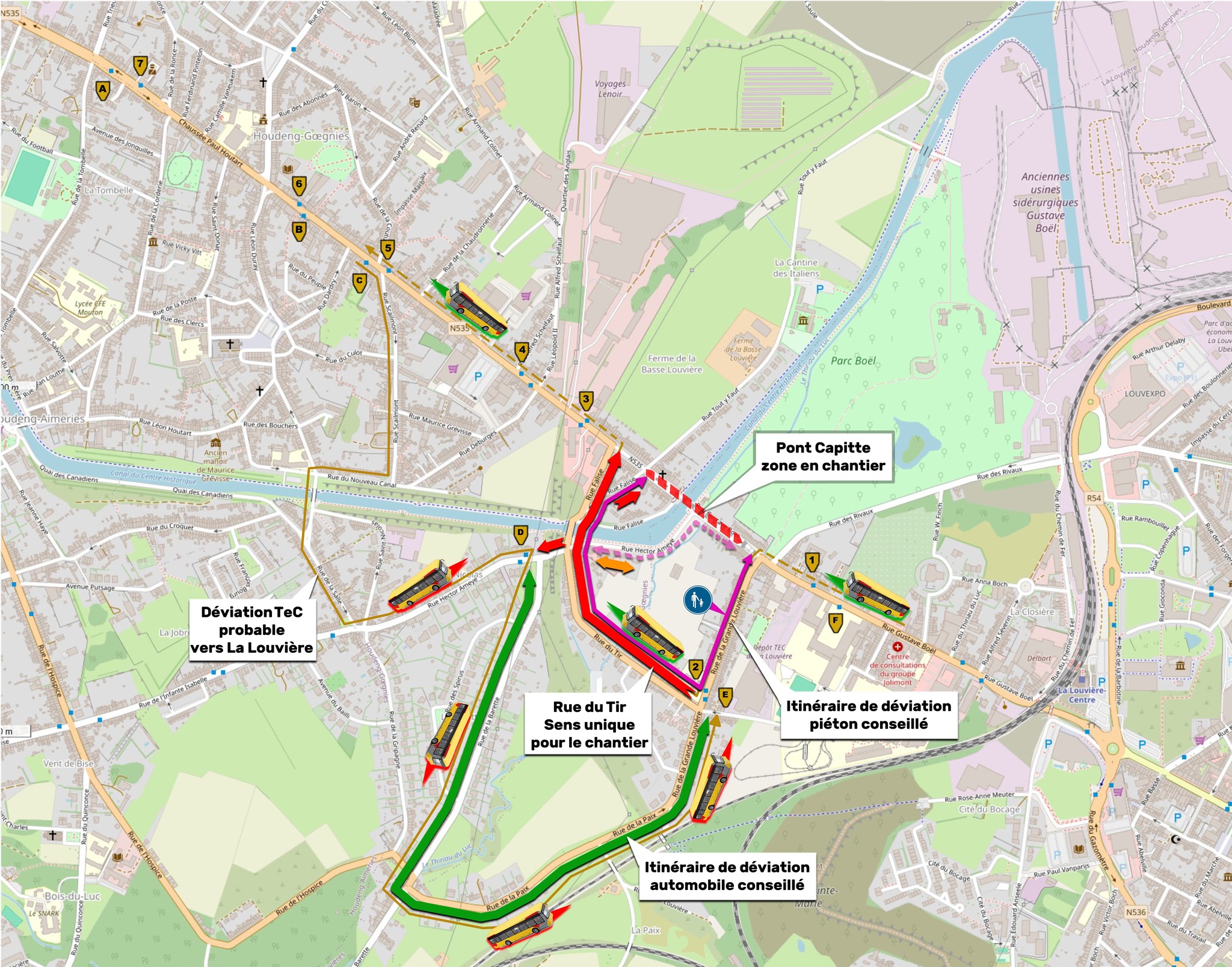 Le chantier de démolition et de reconstruction du pont débutera ce 20 octobre 2025. À partir de cette date, il ne sera plus possible de le franchir à pied ou à vélo. Il faudra donc emprunter la déviation via le pont provisoire et la rue de la Grande Louvière.