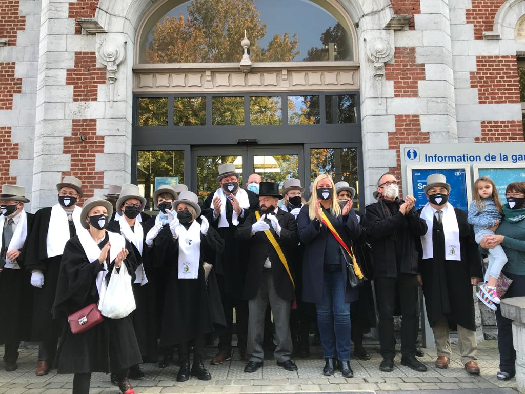 Symboliquement la Confrérie de l'Araignée, les Grenadiers de la Garde Impériale et les Géants de Soignies étaient de sortie. Devant la gare, la Fanfare de Soignies a joué les 3 airs traditionnels: ce n'était pas la grande foule mais la joie était belle et bien présente autant chez les acteurs et que les spectateurs.