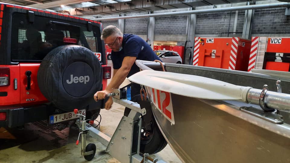 Quatre pompiers plongeurs de la caserne de La Louvière se préparent pour aider la population en province de Liège.